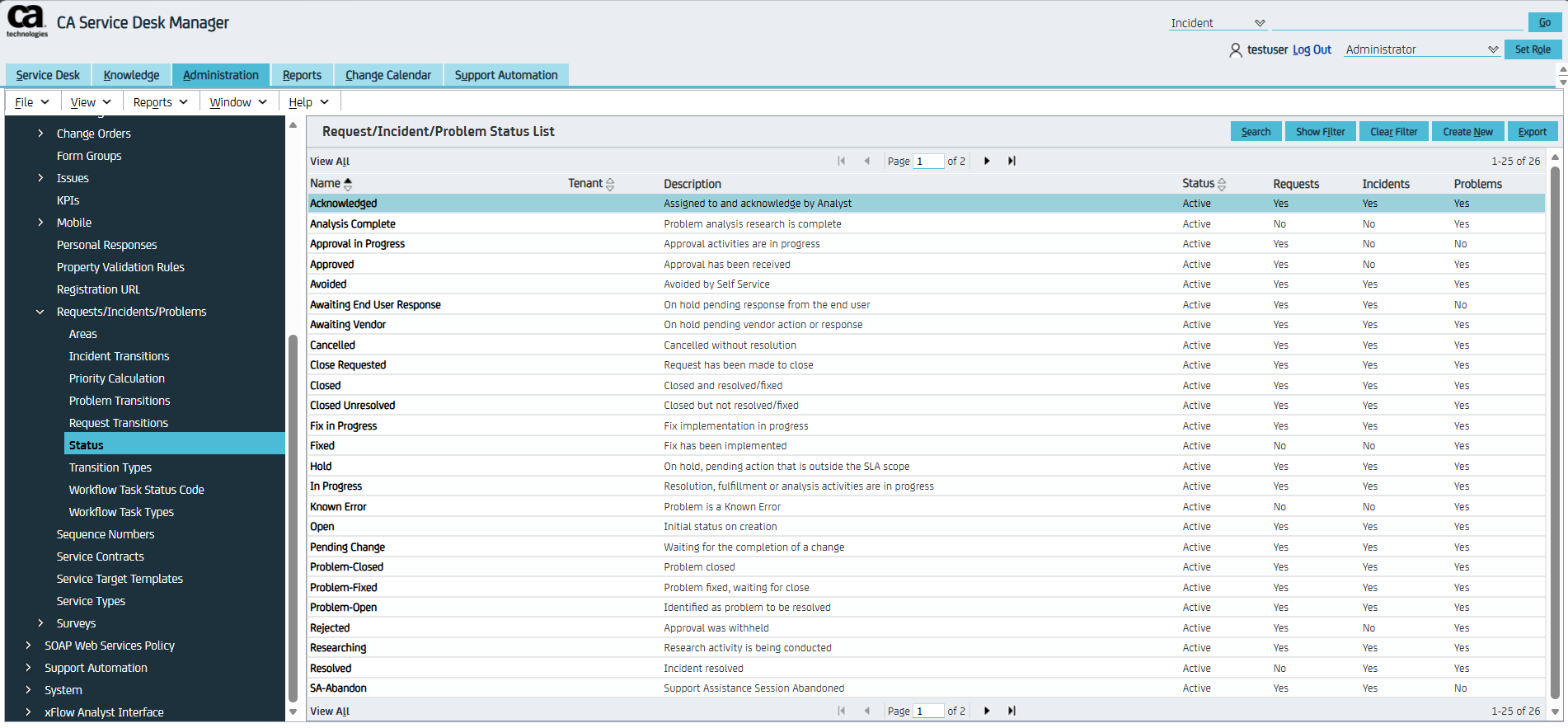* User can view the status list of Request/ Incident/ Problem by Administration -> Service Desk -> Requests/Incidents/Problems -> Status.