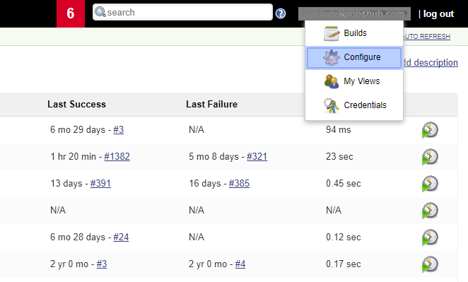 * Login with the user credentials assigned to you. This will open the home page of the Jenkins account. On the home page, navigate to the top-right corner, and click the dropdown arrow adjacent to the user account's name and select **Configure** from the dropdown menu.