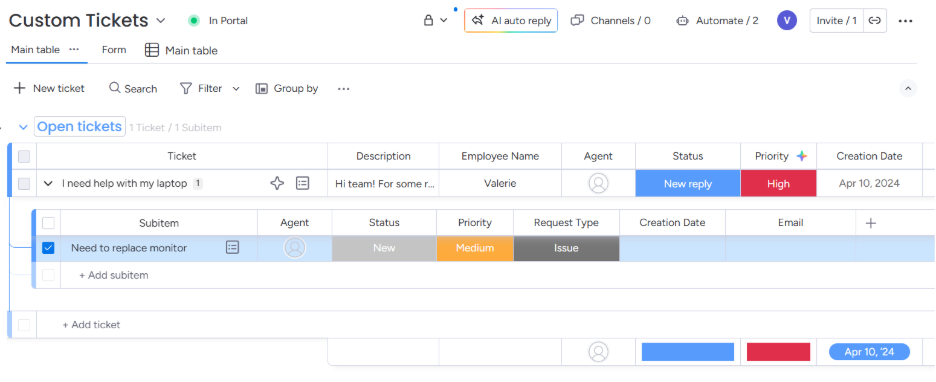 * In the screenshot below, ticket with name “Need to replace monitor” is a sub item under the parent item with name “I need help with my laptop”: