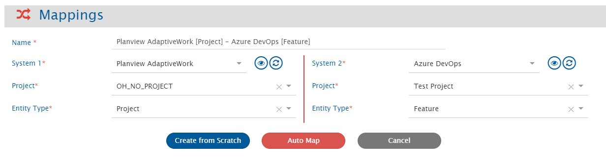 > **Note** In Planview AdaptiveWork, selecting the entity type in mapping configuration does not depend on the project selection as 'Project' works as an entity in the end system. So, the user needs to select OH\_NO\_PROJECT in the projects' tab.