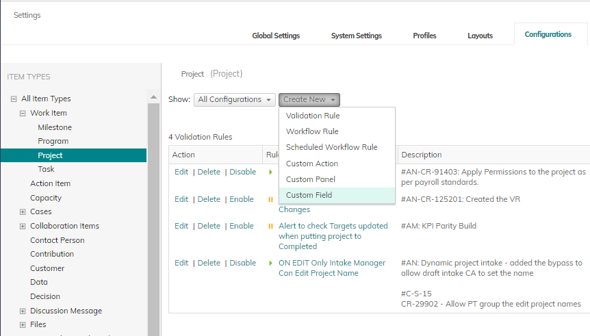 3 . Select the Item type/Entity for which the user wants to create the custom field. Select **Custom Field** from **Create New** as shown in the screenshot below: