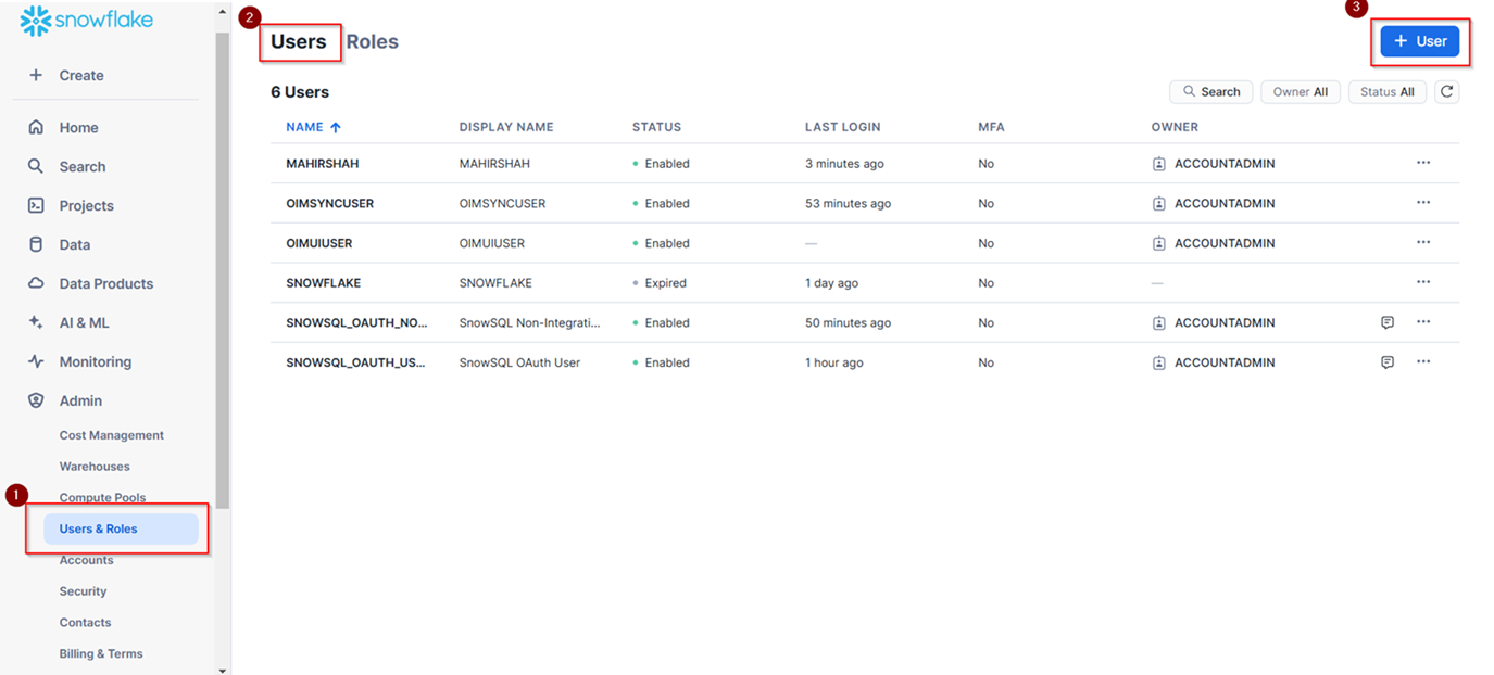 1. Log in to Snowflake instance using the admin user with privileges to create a new user and role.