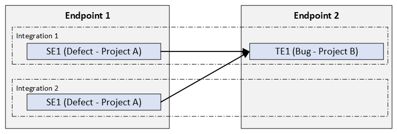 * The Defect entity SE1 of the Project A in Endpoint 1 will be synchronized as a Bug entity TE1 in 'Project B' of Endpoint 2 via Integration 1 and Integration 2. So, there will be no entity corresponding to SE1 in the 'Project C' of the Endpoint 2: