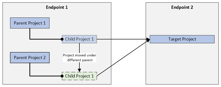 * If the 'Child Project 1' is moved under 'Parent Project 2' in Endpoint 1, <code class="expression">space.vars.SITENAME</code> will synchronize the SE1 either by updating the project of TE1 to 'Target Project 2' (if Endpoint 2 supports project update) or create a new entity TE2 in 'Target Project 2' and deprecate TE1 (if Endpoint 2 does not support project update).