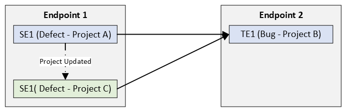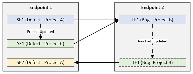 * Afterwards, if the Bug entity TE1 is updated in the Endpoint 2, it will create a new Defect entity in 'Project A' of Endpoint 1, i.e., SE2: