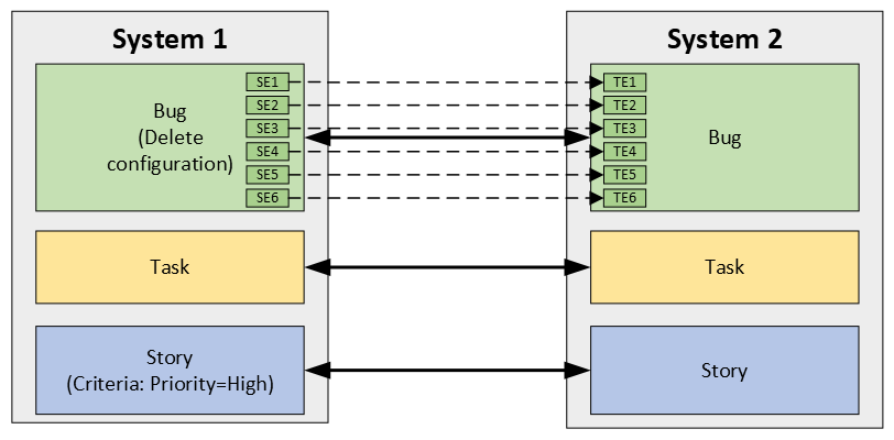 * Updates on the SE3 and SE4 will be synchronized to the target entities TE3 and TE4 respectively via Task and Story integration.