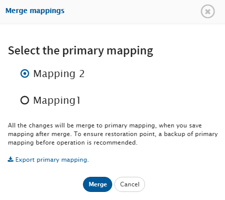 * Click the "Merge Mapping" option. Select the Primary Mapping. Take the backup of the primary mapping and refer to the instructions on the screen before clicking the Merge button.\\