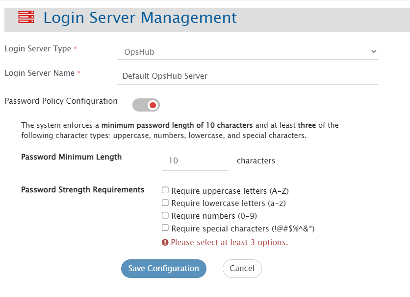 **Admin** users with the **Super Administration** role can define the password security standards for users authenticating via the default server. By default, the system enforces a password strength policy requiring a **minimum of 10 characters** and at least **three of the four** available character types: