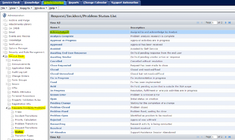 * User can view the status list of Request/ Incident/ Problem by Administration -> Service Desk -> Requests/Incidents/Problems -> Status.
