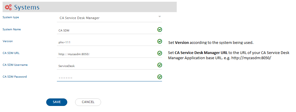 Before you continue to the integration, you must first configure CA Service Desk Manager. Click [System Configuration](https://docs.opshub.com/v7.207/integrate/configure-integrations/system-configuration) to learn the step-by-step process to configure a system. Refer the screenshot given below for reference.