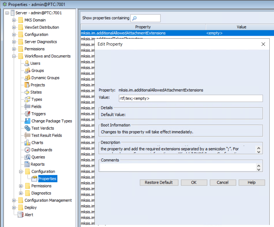 * On the left panel navigate to Workflows and Documents > Configuration > Properties > **mksis.im.additionalAllowedAttachmentExtensions**