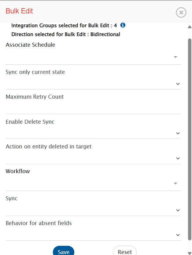 * **Bulk Edit Forward**: Configure the bulk edit settings in forward direction for the selected integration groups.