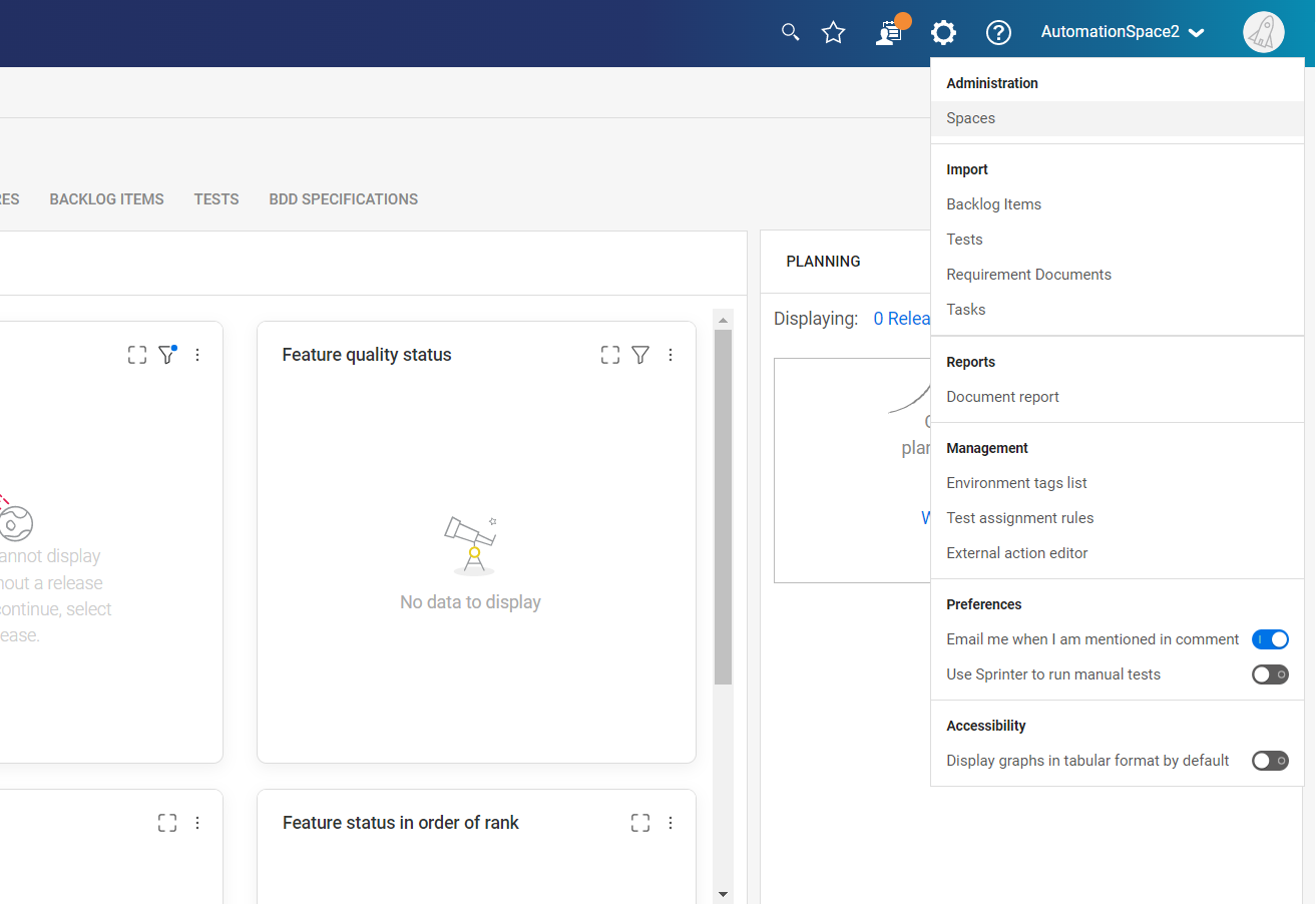 * Navigate to the ALM Octane homepage. A dropdown menu will appear on clicking settings icon.