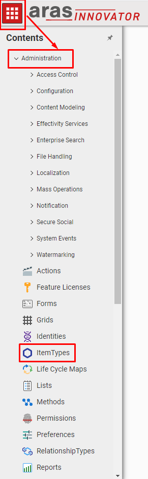 2. Navigate to **Administration → ItemTypes**. Refer [Check Administration Tab](#check-administration-tab) to learn where to find Administration tab.