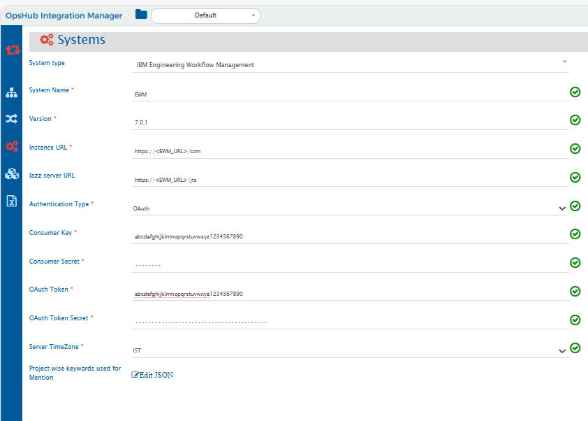 | **Consumer Key**                           | Only when OAuth Authentication is selected   | Set **OAuth Consumer Key** as generated by the IBM Engineering Workflow Management admin and jazz server                                                                                                                                                |