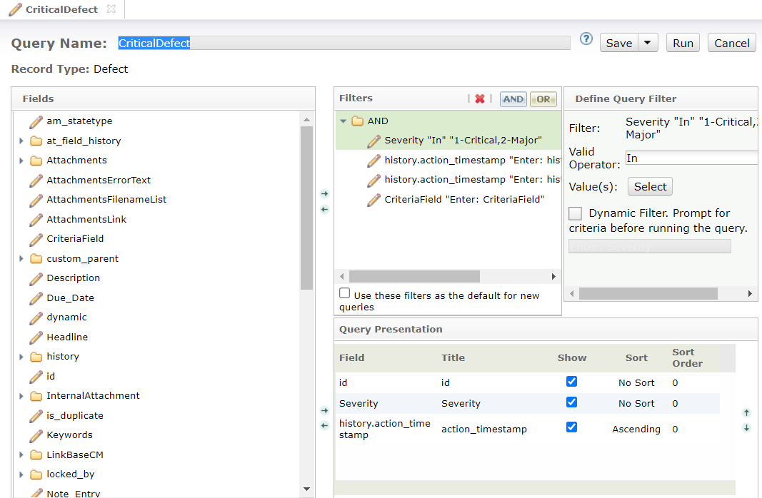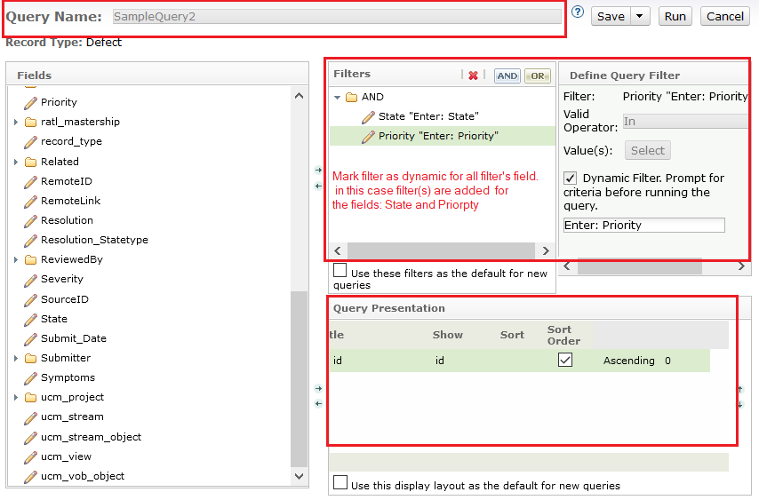 * Follow the given order of fields in Filters, and Query Presentation.