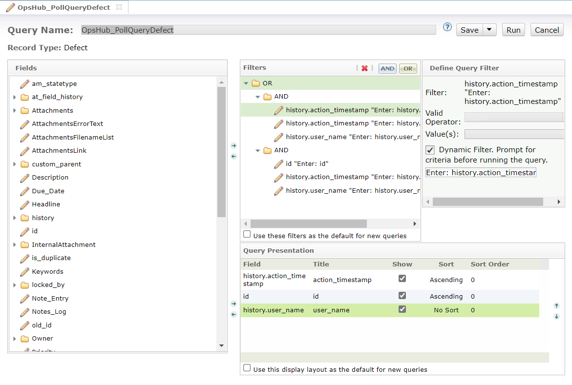 * Create a query, `OpsHub_PollQueryDefect` with the following configuration. This is required to poll data from the entity which has been updated.