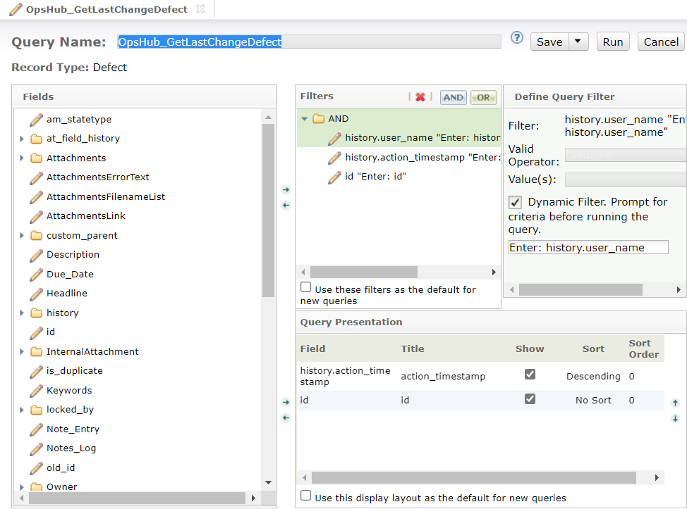 * Create a query, `OpsHub_LastCreatedByIntegrationDefect` with the following configuration. This query is required for finding the maximum update time of an entity lastly updated during integration.