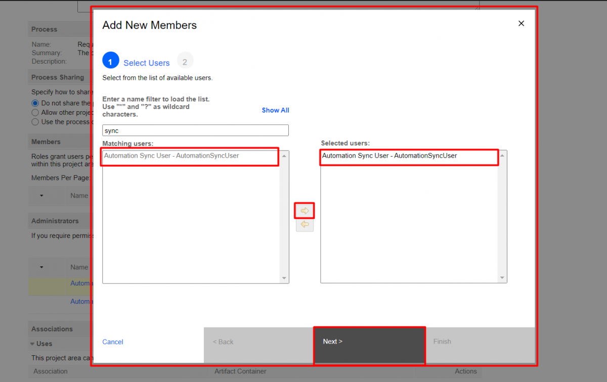* A **Select Users** window will open. Select the user you want to add in the project from **From Matching users** list and click on **Right** arrow as shown in the below image. The user will be added in the **Selected users** list. Click **Next**.