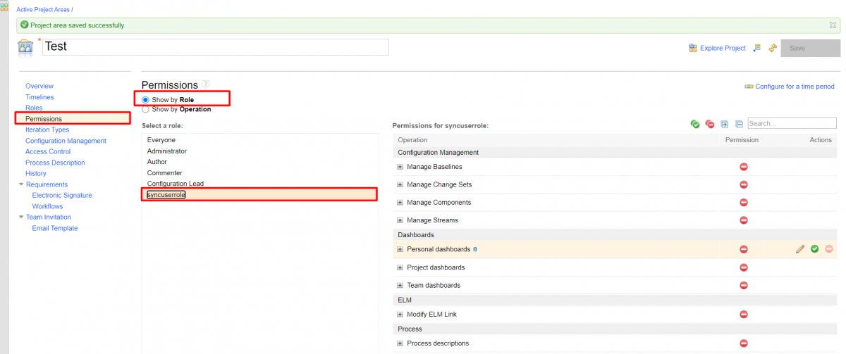 * Under **Project Area**, click on **Permissions**. Select option **Show by Role**. Select the role assigned to sync user. All the permissions will be added to this role.