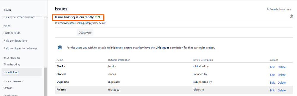 * In Jira, go to **Settings** > Click **Issues** > Click **Issue Linking** > **Issue Linking is currently ON** \[This message should come].