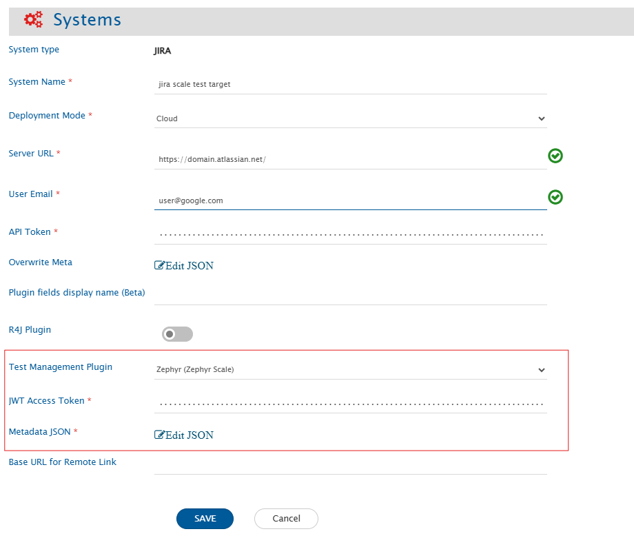 | **JWT Access Token** | Only when Jira's deployment type is Cloud and Zephyr (Zephyr Scale) is selected as the test management plugin | Provide the access token generated in Zephyr for the user given in the "User Email" field. For more details on Access Token, please refer to [User Token Generation](#user-token-generation)                                                                                                                                                     |