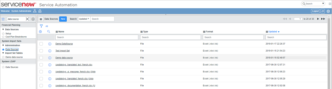 * Now, please go back to ServiceNow, type 'Data source' in the navigator and click 'Data Sources' under 'System Import Sets'.