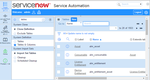 1. Click **Tables** from **System Definition** on left side panel. It will display list of tables as per next step.