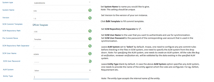 Clicking the Template will bring up the table shown above in a new pop-up window. It will allow you to configure commit template for the Subversion system. Please note that out of all the attributes shown above, Bug Id represented by issueid\_int/ issueid\_str attribute and Reviewer represented by reviewer\_usr attribute are mandatory. In other words, user will need to specify the value of these two attributes in the commit template otherwise commit/check-in will not be allowed. You may also specify pre/post commit default values for the attributes. Post commit values are needed when no template is configured at the SCM level. The values provided under Attribute Display name are case sensitive and are compulsory to be provided while checking-in any file from the repository. For example, for the above configured template, you need to specify the commit template as follows: