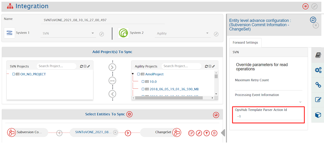 In the Advanced Integration Configuration section, there is a field **OpsHub Template Parser Action Id** when Subversion is the source system.\