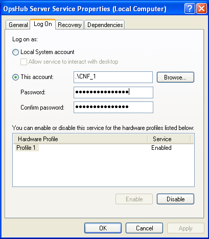 * Select **'This account'** check box for Log on as and provide the username and password of the user for which the certificate was imported.
