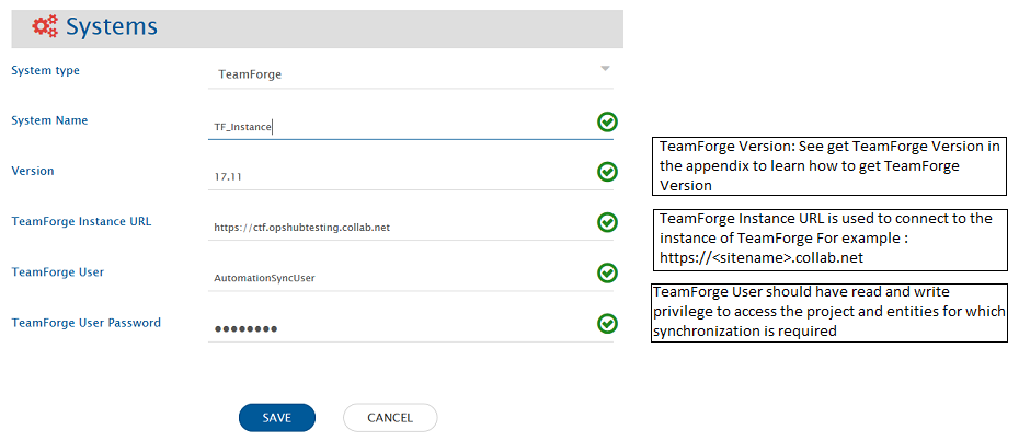 Before you continue to the integration, you must first configure TeamForge. Click [System Configuration](https://docs.opshub.com/v7.215/integrate/configure-integrations/system-configuration) to learn the step-by-step process to configure a system. Refer the screenshot given below.