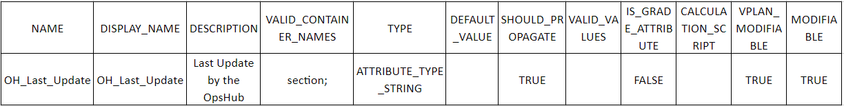 > **Note**: Above csv file can also be created in any Text Editor with contents given below : NAME ,DISPLAY \_NAME ,DESCRIPTION ,VALID \_CONTAINER \_NAMES ,TYPE ,DEFAULT \_VALUE ,SHOULD \_PROPAGATE ,VALID \_VALUES ,IS \_GRADE \_ATTRIBUTE ,CALCULATION \_SCRIPT ,VPLAN \_MODIFIABLE,MODIFIABLE OH \_Last \_Update,OH \_Last \_Update,Last Update by the OpsHub,section;,ATTRIBUTE \_TYPE \_STRING,,TRUE,,FALSE,,TRUE,TRUE