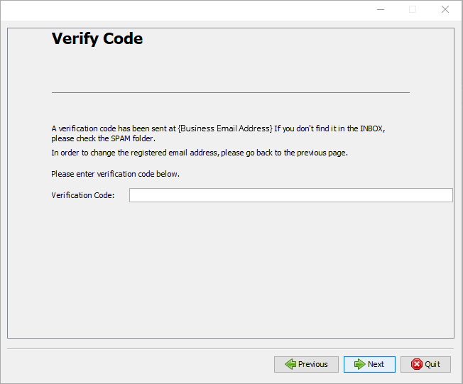 On successful registration, you will get a verification code on your registered business email address. Please enter the verification code in the screen shown below and continue installation/upgradation.