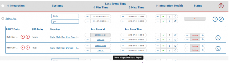Integration Sync Report provides the information for each entity synchronized by <code class="expression">space.vars.SITENAME</code>. The report gives insight into which entity from which project in the source system has synchronized to which project in the target system. The report also shows source entities ids and target entities ids. You can also navigate to the failed event of a particular entity from this report. Each integration has a separate Integration Sync Report.