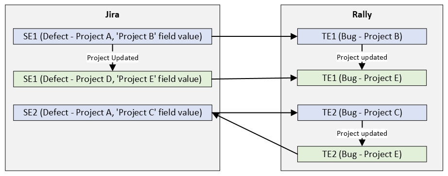 * If the project of the Defect entity SE1 is updated to 'Project D', <code class="expression">space.vars.SITENAME</code> will synchronize this update by updating the project of Rally Bug entity TE1 to 'Project E'.