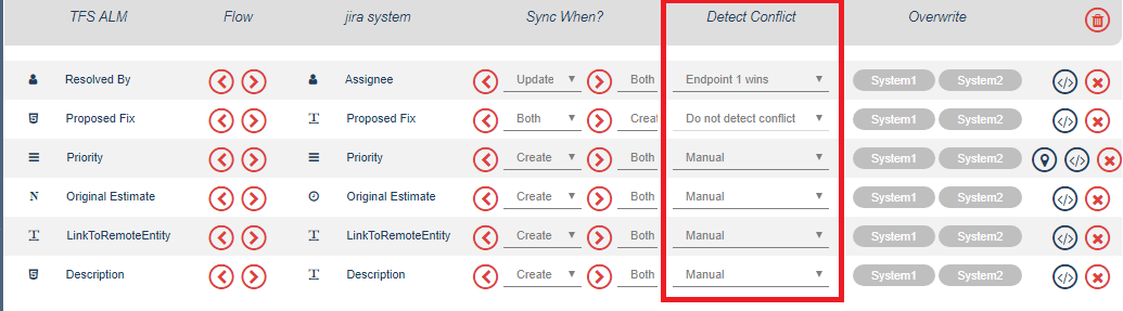 * In the **Detect Conflict** column, define the mechanism to resolve the conflict between System 1 and System 2. The options are: **Do not detect conflict**, **End system 1 wins**, **End system 2 wins**, and **Manual**. Select the relevant option from the **Detect Conflict** drop-down list.