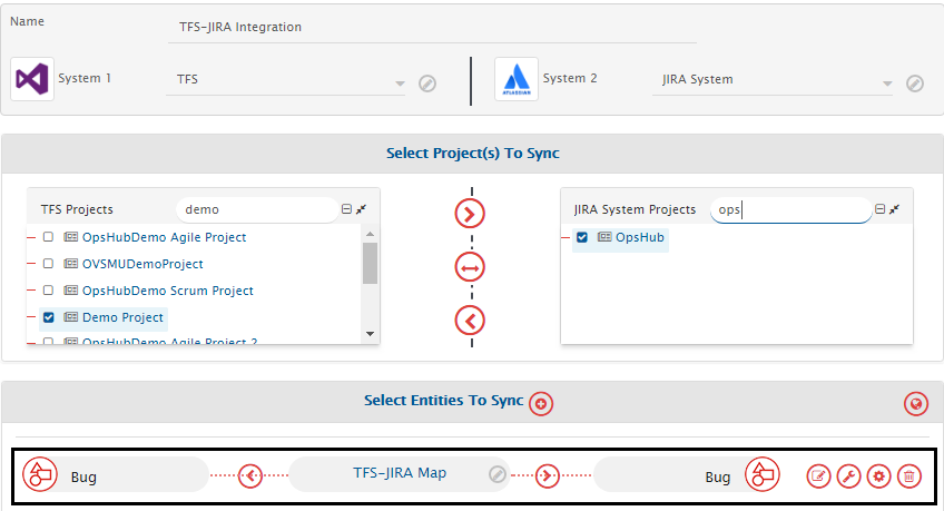 * From the **Issue/Entity Type** drop-down lists, select the relevant entity within the project that you want to integrate. For example, we select Bug in both the systems.