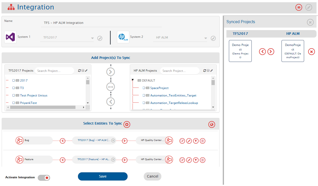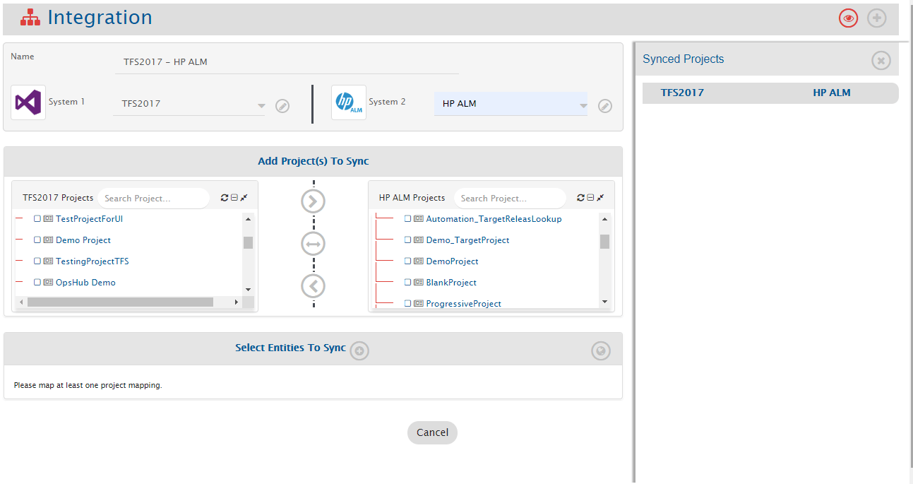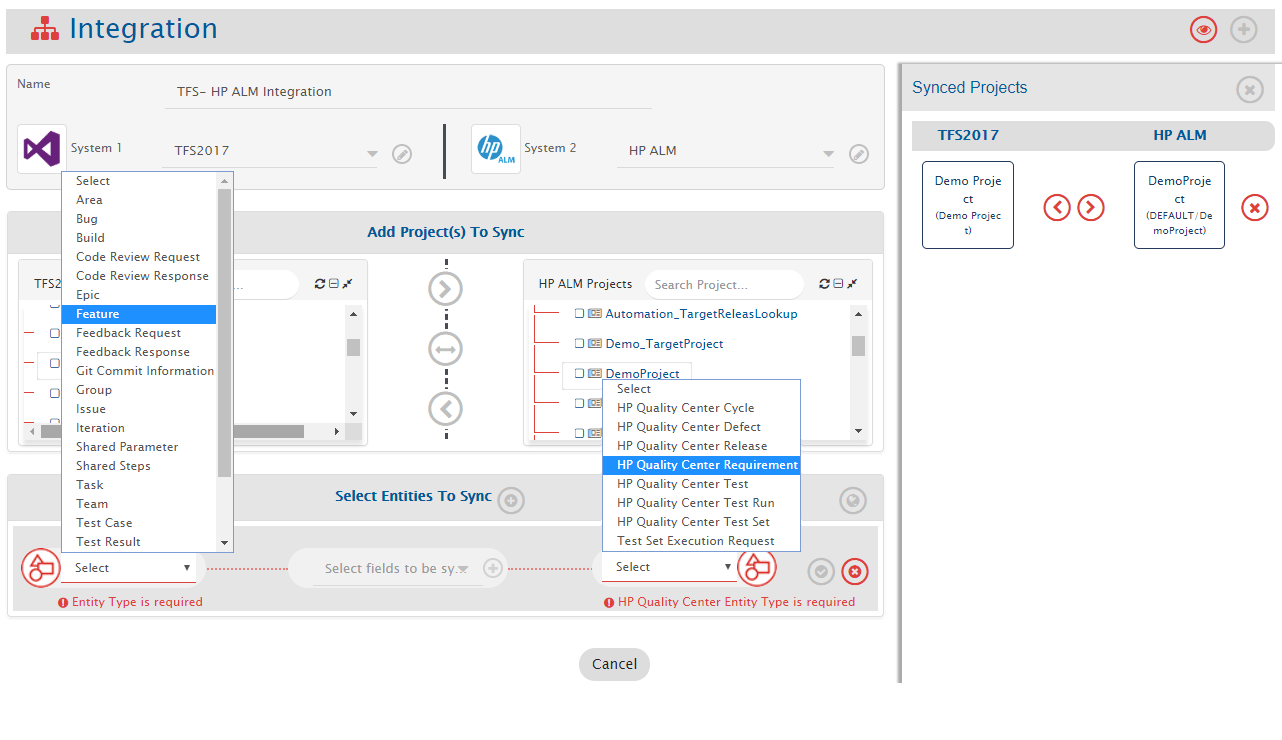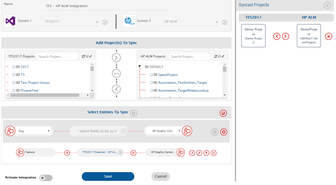 Example: **Demo Project3** from Azure DevOps Server (TFS) and **Demo\_SourceProject** from Micro Focus ALM.