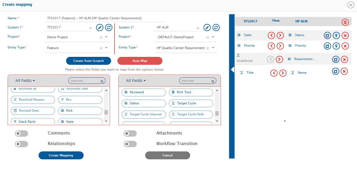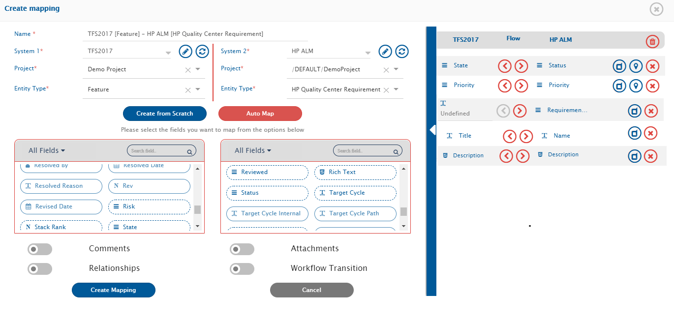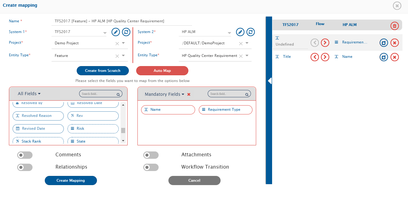 * Choose Mandatory field(s) for Azure DevOps Server (TFS) first and map them to the equivalent field in Micro Focus ALM, then repeat the same steps for Micro Focus ALM.