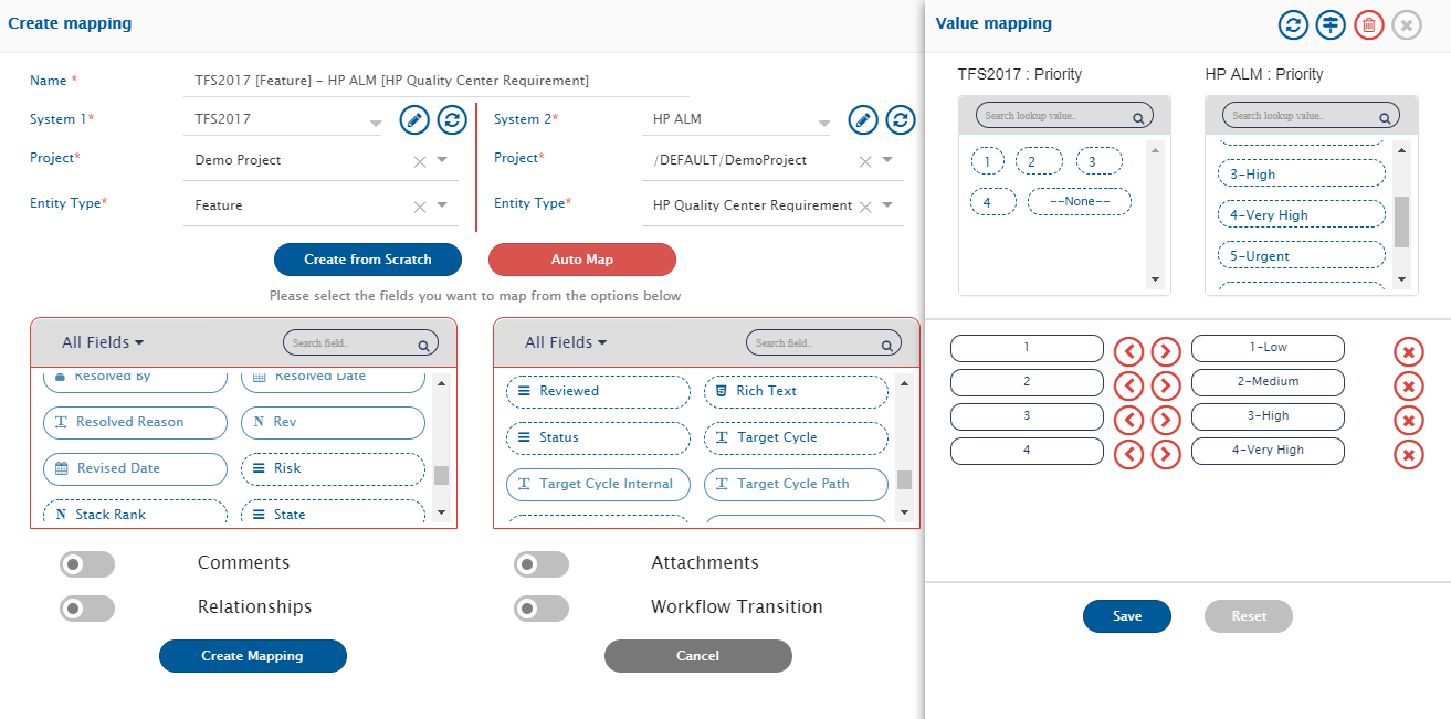 * The Status and Priority are Look-up type fields. They are marked with ![lookup](https://818964384-files.gitbook.io/~/files/v0/b/gitbook-x-prod.appspot.com/o/spaces%2FK5eA7qMDBFu0HHHMDehi%2Fuploads%2Fgit-blob-e738613e7434e09ede58bd9212168a30936bfe5c%2FI_9.png?alt=media). Once you have mapped these fields in Azure DevOps Server (TFS) and Micro Focus ALM, click the icon to map their values one by one.