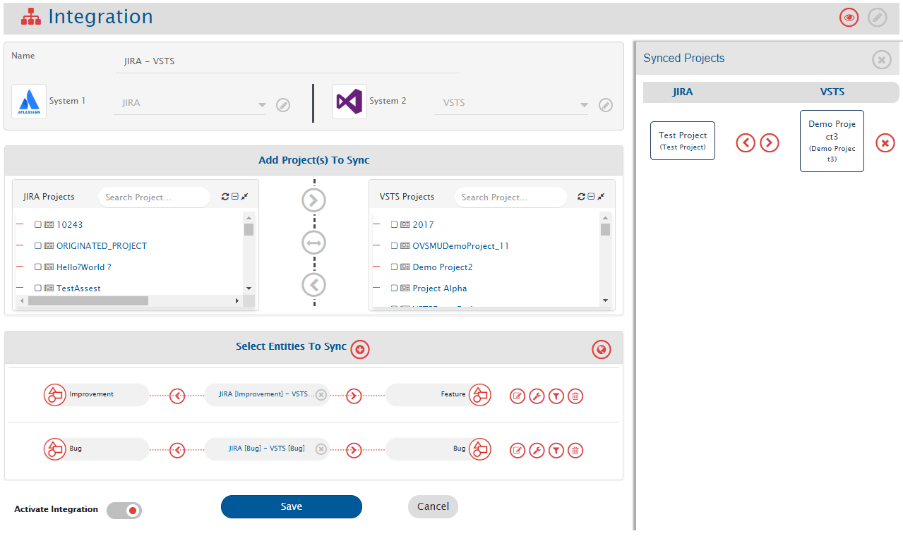 * <code class="expression">space.vars.SITENAME</code> fetches entities available in both systems and shows them in entities list for both systems. From the **Select Entities to Sync** section, select the relevant entities for both systems. In this case, we will select **Improvement** from Jira and **Feature** from Azure DevOps Services (VSTS).