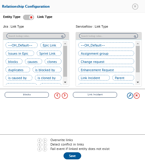 > **Note**: In the image given below, we have mapped *blocks* in Jira with *Link Incident* in ServiceNow (ServiceNow shows reference type field names in link type, in your case it can be something other than *Link Incident*).