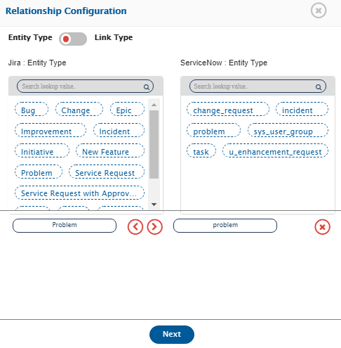 * Map the entities you want to link with Incident. In this case, we will map Jira Problem with ServiceNow Problem. This means that if Incident in Jira is linked to Problem then it should be linked to entity of type Problem in ServiceNow.