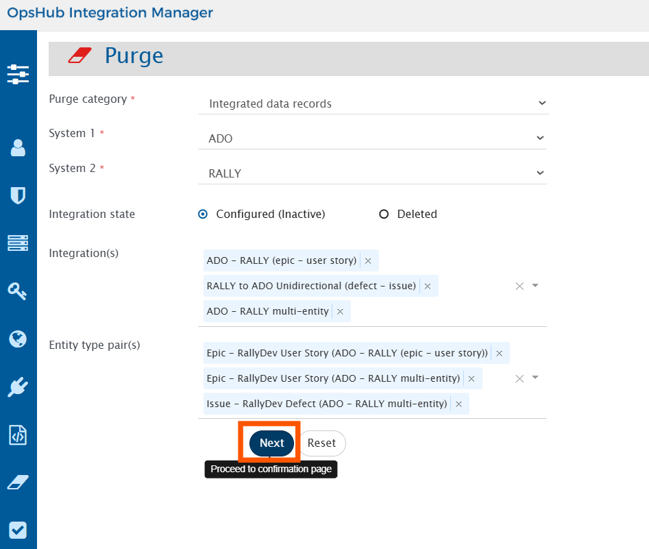 Click on **Purge** to purge the selected records from the **OpsHub** database.