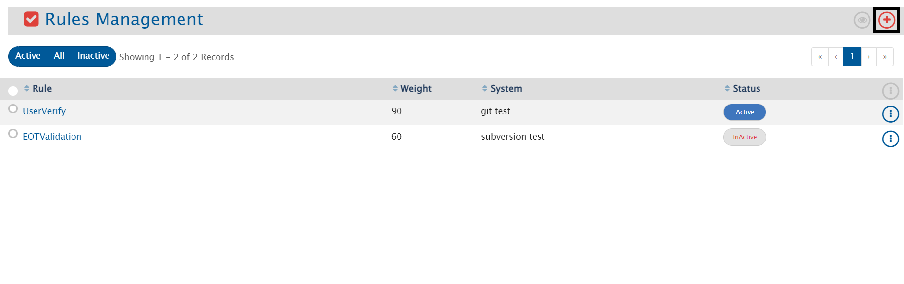 * **Activate/Inactivate rules**: Select the *Status* button against the rule for which you want to toggle the status. The status will change from *Active* to *Inactive* or from *Inactive* to *Active*