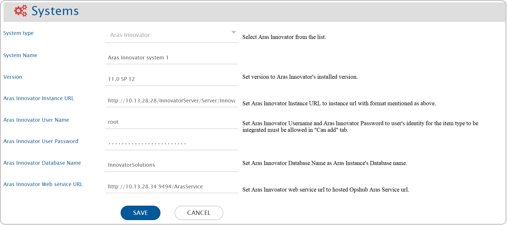 Before the user continues with the integration, he/she must first configure Aras Innovator System. Refer to [System Configuration](https://docs.opshub.com/v7.216/integrate/configure-integrations/system-configuration) to learn step-by-step process to configure a system. See the screenshot given below for reference: