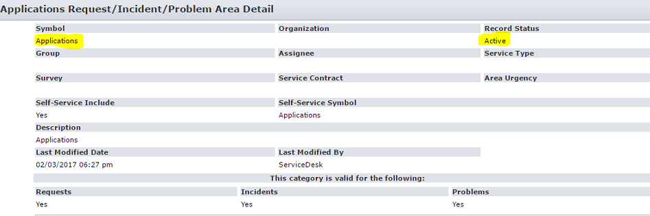 * For example, (Areas='Active') where Active = Record Status for symbol "Applications" User can view the Areas list of Request/Incident/Problem by Administration -> Service Desk -> Requests/Incidents/Problems -> Areas