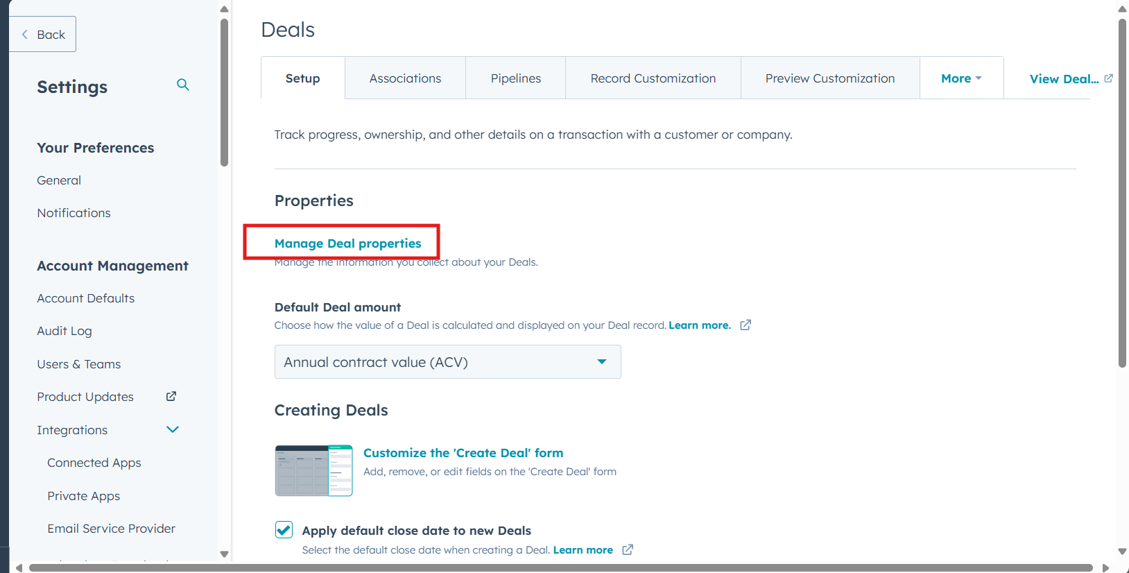 3. Click **Manage Deal Properties** to view all deal entity fields.