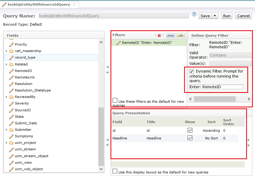 * Create a query, `OpsHub_PollQueryDefect` with the following configuration. This is required to poll data from the entity which has been updated.